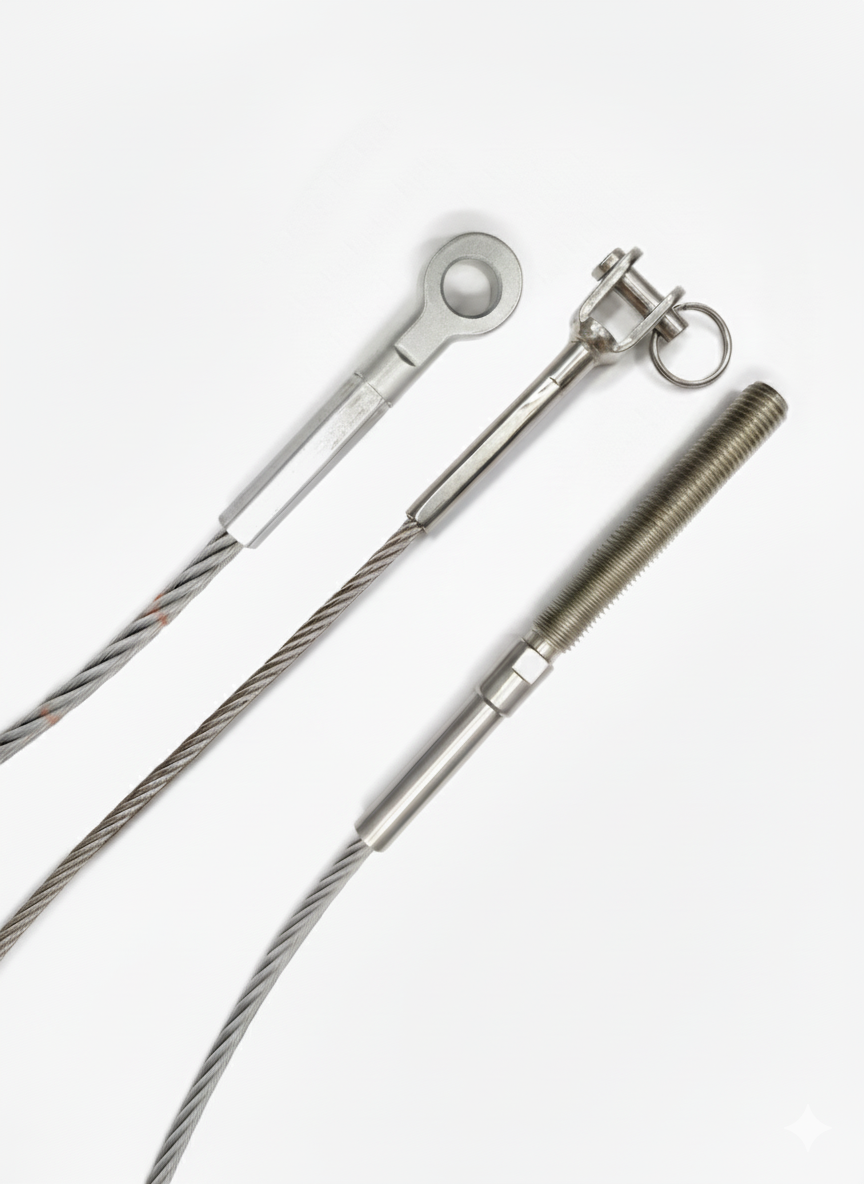 - ワイヤロープの先端に専用の金具を被せ、プレス機で強力に圧縮して固定する加工法